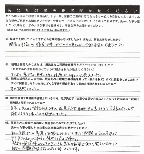 坂元えみこ税理士事務所と契約されてみていかがでしたか?良かった事や嬉しかった事など率直な声をお聞かせください。